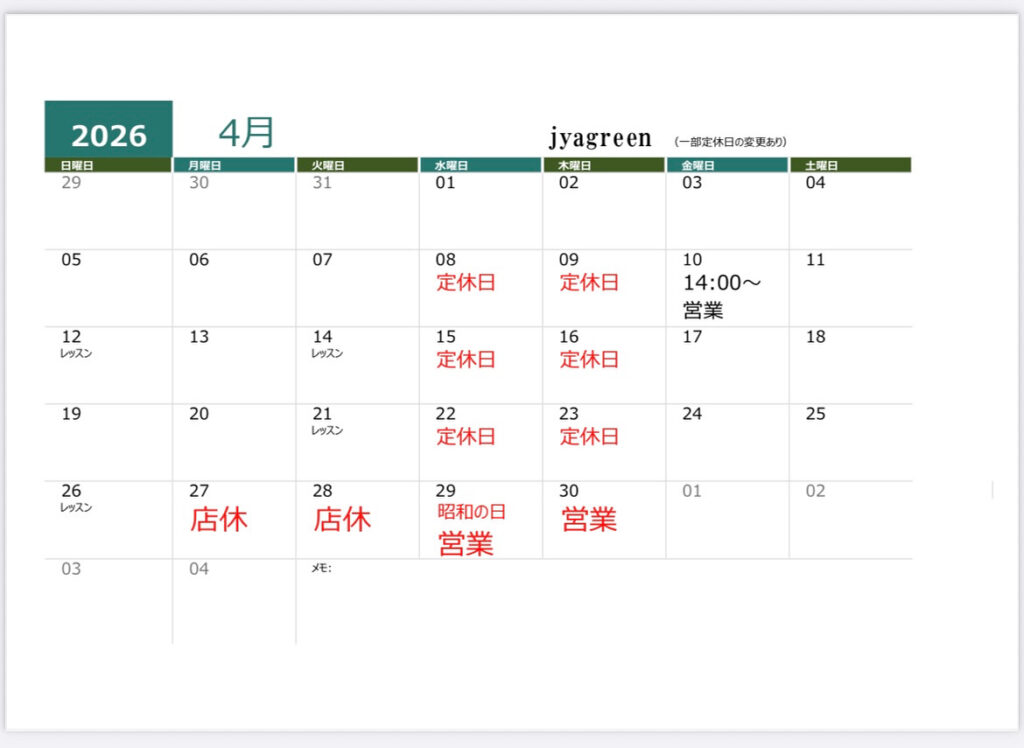 4月は最終週のみ都合により定休日を変更させていただきます。